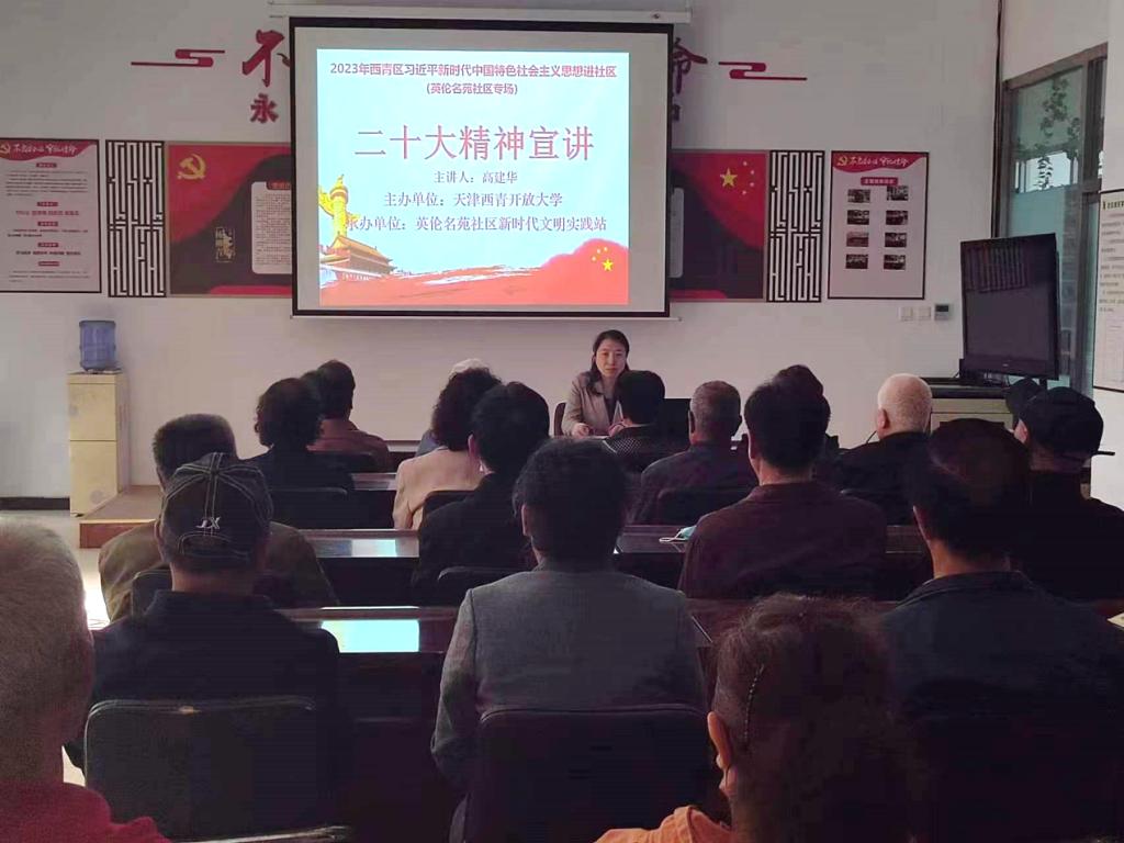 一年多来,在西青区各社区举办专题讲座,深入解读党的二十大报告和党章修正案,阐释党的二十大精神对于国家发展、城市建设、社会治理、人民生活等方面的重要意义和指导作用。先后开展线上、线下多种形式20余场宣讲活动,覆盖全区11个街镇近万名群众。