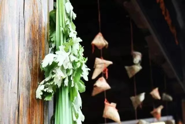 【门口挂艾草和菖蒲】端午过后,邪气主要是湿热、秽浊,所以要芳香化湿,芳香化浊,端午节的习俗中总离不开芳香。民谚说:“清明插柳,端午插艾”。在端午节,人们把插艾和菖蒲作为重要内容之一。家家都洒扫庭除,以菖蒲、艾条插于门眉,悬于堂中。艾,又名家艾、艾蒿。它的茎、叶都含有挥发性芳香油。它所产生的奇特芳香,可驱蚊蝇、虫蚁,净化空气。中医以艾入药,有理气血、暖子宫、祛寒湿的功能。将艾叶加工成“艾绒”,是灸法治病的重要药材。菖蒲是多年生水生草本植物,它狭长的叶片也含有挥发性芳香油,是提神通窍、健骨消滞、杀虫灭菌的药物。可见,古人插艾和菖蒲是有一定防病作用的。